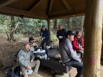 何人か東屋の下で 屋根が傷んでる